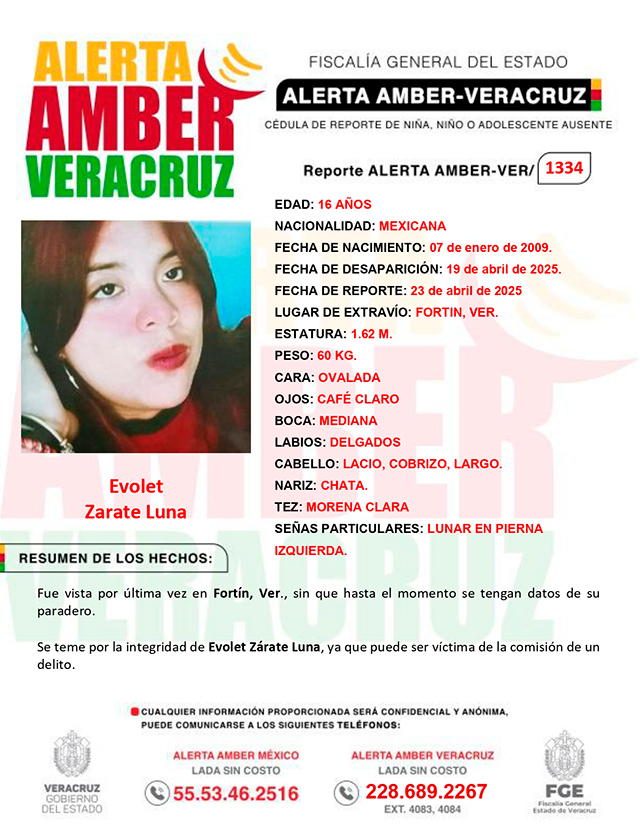 Activación de la Alerta Amber 1334 por la adolescente Evolet Zárate Luna de 16 años de edad.