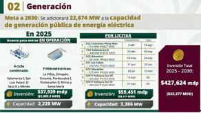 La funcionaria detalló que 4 mil 624 millones de pesos serán de inversión pública y se anunció que la meta para 2030 es adicionar 22 mil 674 MW a la capacidad de generación pública de energía eléctrica.