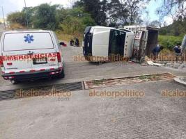Camioneta se va sin control por pendiente y en reversa; termina por volcar, en Xalapa