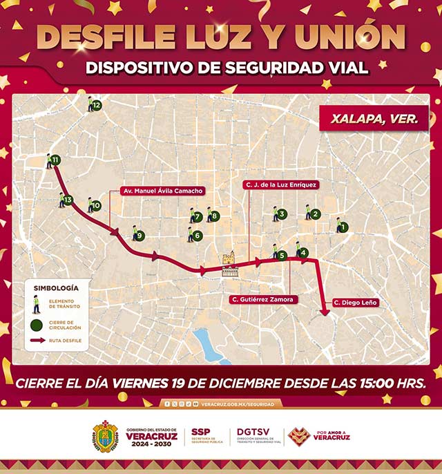 Xalapa, Ver., 18 de diciembre de 2025.- La SSP pidió programarse y anticipar recorridos debido al desfile "Luz y Unión". Calles del Centro serán cerradas a partir de las 15:00 horas de este viernes.