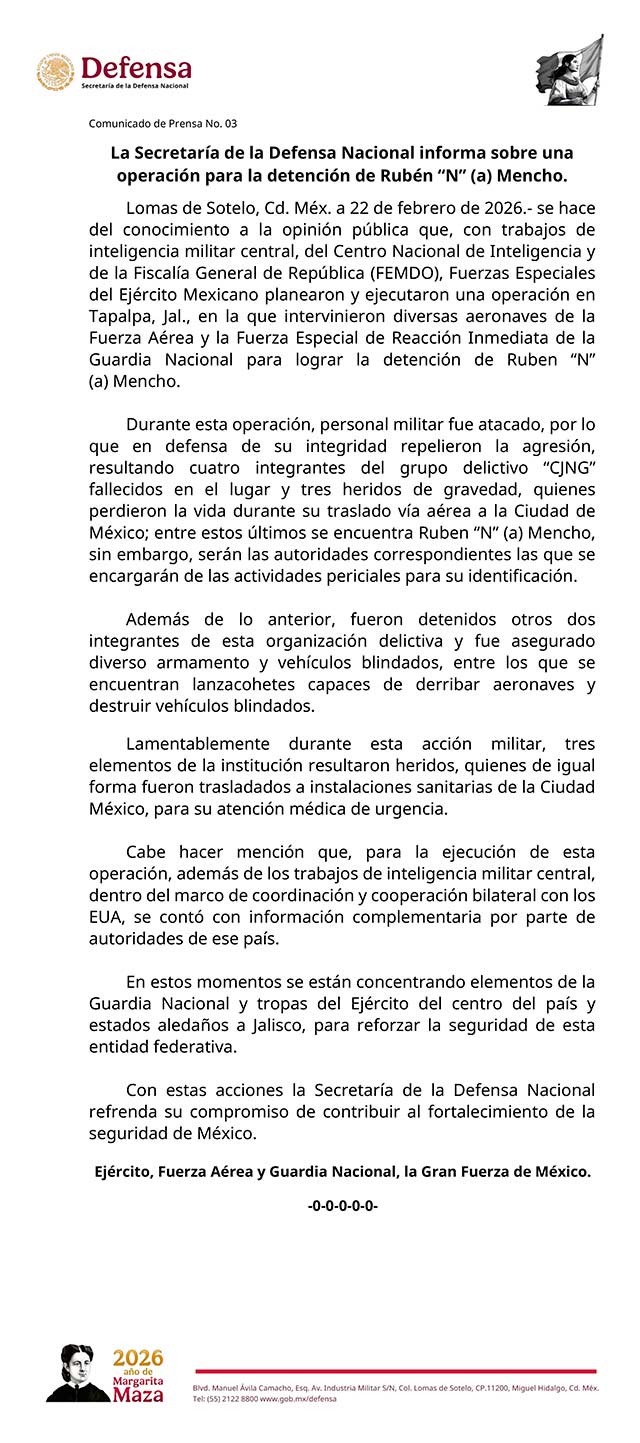 La Secretaría de la Defensa Nacional informó que Rubén “N”, identificado como Mencho, perdió la vida tras un operativo realizado en Tapalpa, Jalisco, como resultado de una acción coordinada entre fuerzas federales, apoyada en labores de inteligencia militar y cooperación bilateral con Estados Unidos.