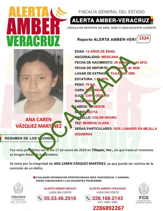 El programa Alerta Amber Veracruz, agradece su colaboración e informa la desactivación de la ALERTA AMBER- VERACRUZ 1524 por la adolescente Ana Caren Vázquez Martínez quien cuenta con 13 años de edad