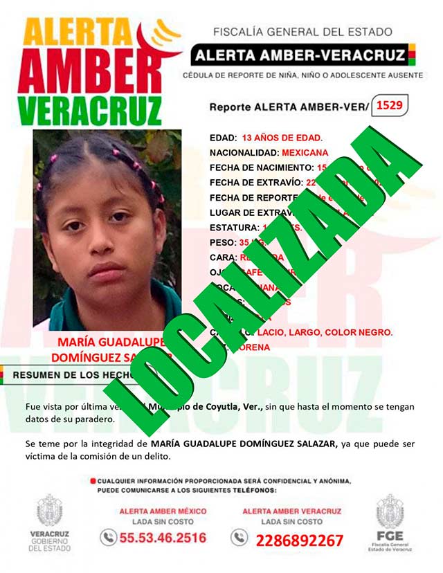 El programa Alerta Amber Veracruz, agradece su colaboración e informa la desactivación de la ALERTA AMBER- VERACRUZ 1529 que fuera emitida por María Guadalupe Domínguez Salazar de 13 años de edad