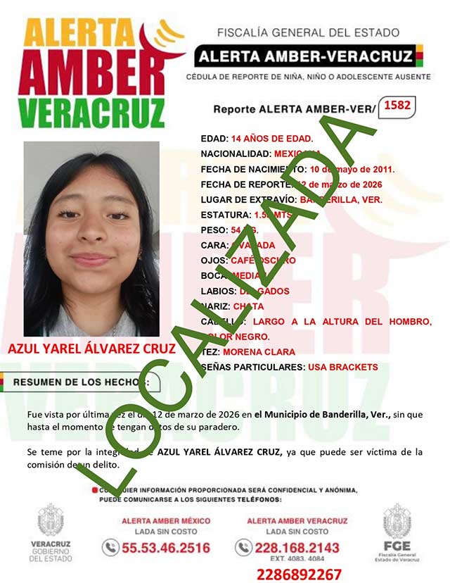 El programa Alerta Amber Veracruz, agradece su colaboración e informa la desactivación de la ALERTA AMBER- VERACRUZ 1582 por la adolescente Azul Yarel Álvarez Cruz de 14 años de edad