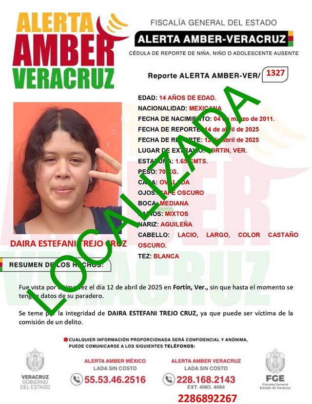 El programa Alerta Amber Veracruz, solicita su colaboración para la desactivación de la ALERTA AMBER- VERACRUZ 1327 por la adolescente Daira Estefani Trejo Cruz de 14 años de edad