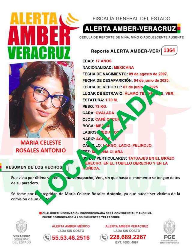 El programa Alerta Amber Veracruz, agradece su colaboración e informa la desactivación de la ALERTA AMBER- VERACRUZ 1364 por la adolescente María Celeste Rosales Antonio, de 17 años de edad.