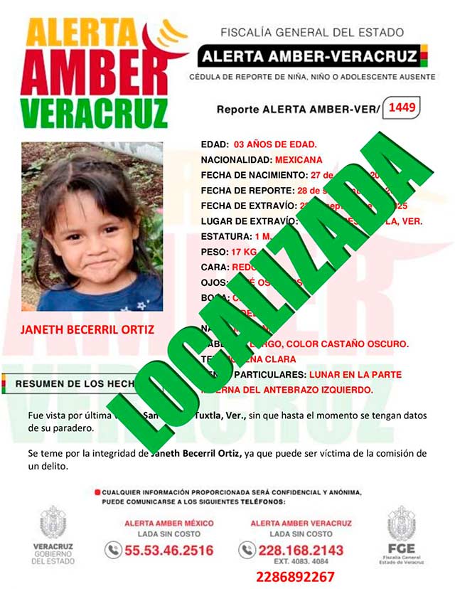 El programa Alerta Amber Veracruz, agradece su colaboración e informa la desactivación de la ALERTA AMBER- VERACRUZ 1449 por la niña Janeth Becerril Ortiz
