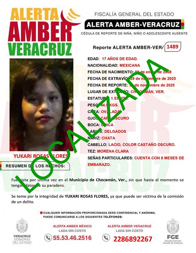 El programa Alerta Amber Veracruz, agradece su colaboración e informa la desactivación de la ALERTA AMBER- VERACRUZ 1489 por la adolescente Yukari Rosas Flores de 17 años de edad