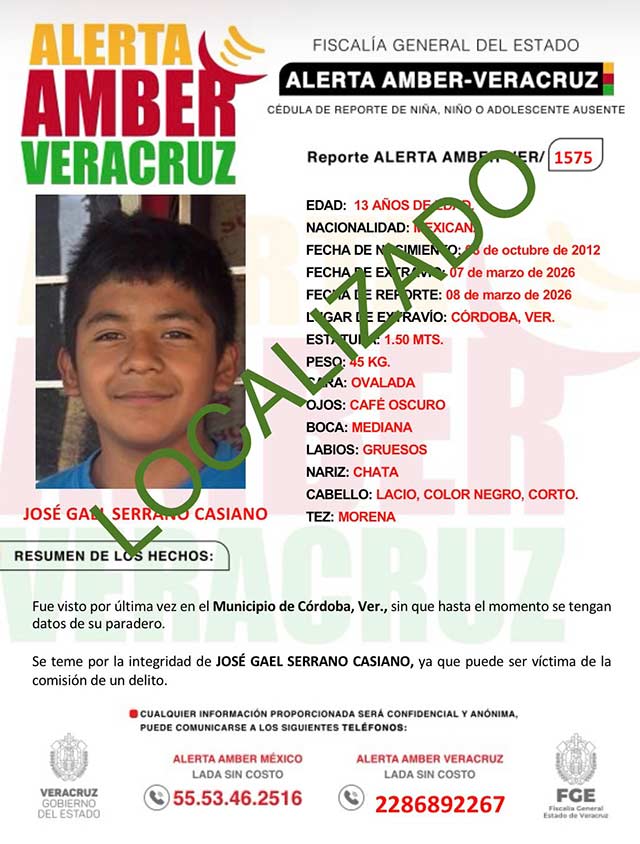 El programa Alerta Amber Veracruz, agradece su colaboración e informa la desactivación de la ALERTA AMBER- VERACRUZ 1575 por el adolescente José Gael Serrano Casiano