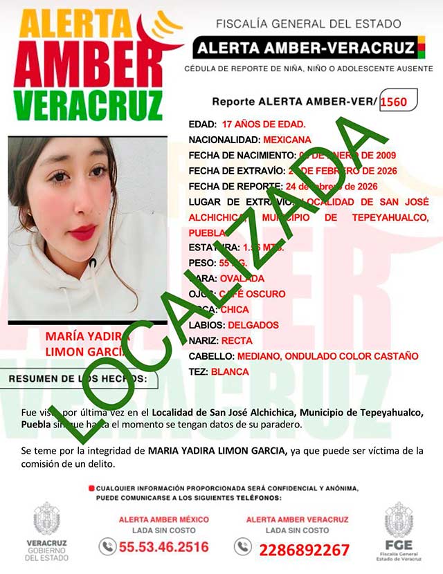 El programa Alerta Amber Veracruz, agradece su colaboración e informa la desactivación de la ALERTA AMBER- VERACRUZ 1560 por la adolescente María Yadira Limón García de 17 años de edad