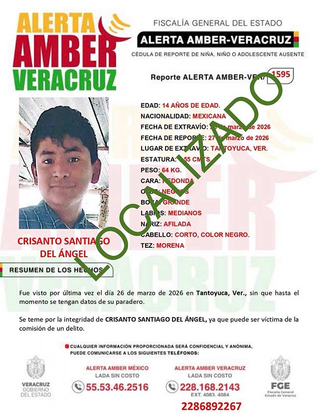 El programa Alerta Amber Veracruz, informa la desactivación de la ALERTA AMBER- VERACRUZ 1595 por el adolescente Crisanto Santiago del Ángel de 14 años de edad