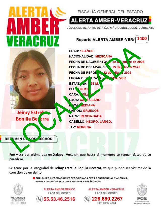 El programa Alerta Amber Veracruz, agradece su colaboración e informa la desactivación de la ALERTA AMBER- VERACRUZ 1400 por la adolescente Jeimy Estrella Bonilla Becerra de 16 años de edad
