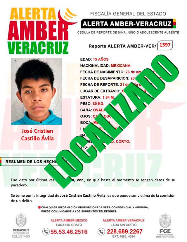 El programa Alerta Amber Veracruz, agradece su colaboración e informa la desactivación de la ALERTA AMBER- VERACRUZ 1397 por el adolescente José Cristian Carrillo Ávila de 15 años de edad