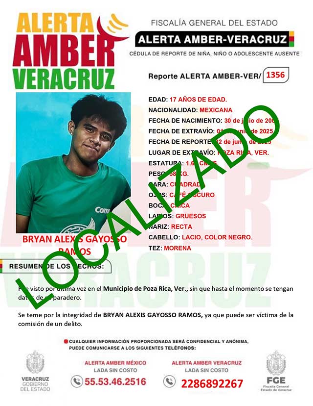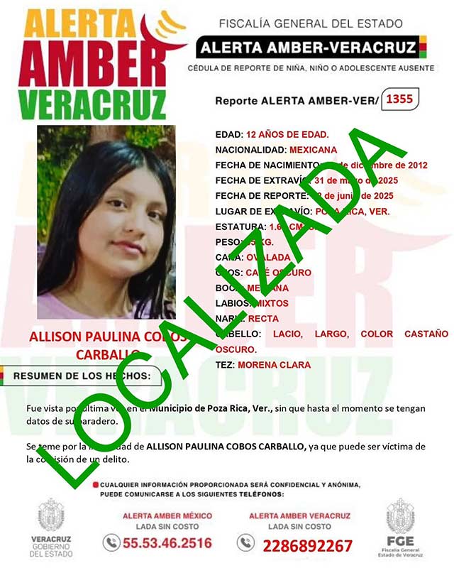 El programa Alerta Amber Veracruz, agradece su colaboración e informa la desactivación de la AAmber-VER 1355 por la adolescente Allison Paulina Cobos Carballo de 12 años de edad y la AAmber-VER 1356 por el adolescente Bryan Alexis Gayosso Ramos de 17 años de edad