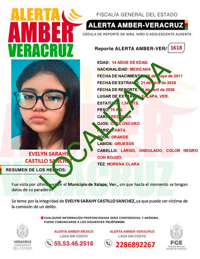 El programa Alerta Amber Veracruz, agradece su colaboración e informa la DESACTIVACION de la ALERTA AMBER- VERACRUZ 1618 por la adolescente EVELYN SARAHY CASTILLO SANCHEZ de 14 años de edad.