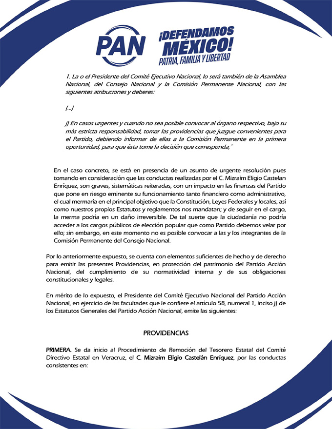 Tras la revisión de los antecedentes, el CEN determinó que las conductas acreditadas actualizan los supuestos para iniciar la remoción del tesorero, así como intervenir la Tesorería Estatal de Veracruz hasta por seis meses, con fundamento en los Estatutos Generales y en el Reglamento para la Administración del Financiamiento del Partido.