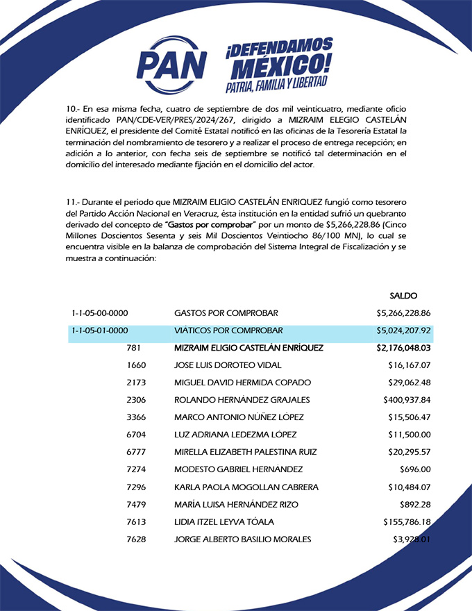 El Partido Acción Nacional (PAN) enfrenta uno de los procesos internos con mayor descontrol financiero en Veracruz, luego de que el Comité Ejecutivo Nacional (CEN) documentó un quebranto por más de 5.2 millones de pesos en viáticos y gastos por comprobar, así como múltiples incumplimientos administrativos, tributarios y de fiscalización durante la gestión del tesorero estatal Mizraim Eligio Castelán Enríquez. Estas irregularidades motivaron el inicio del procedimiento de remoción en su contra y la intervención directa de la Tesorería Estatal.