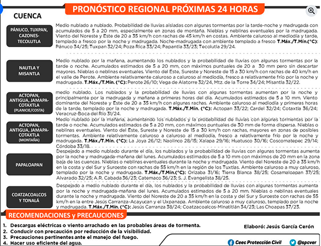 En Veracruz se prevén lluvias con intervalos de chubascos (5.1 a 25 mm) en zonas montañosas, especialmente del Nautla, Actopan, La Antigua, Jamapa-Cotaxtla y Papaloapan, siendo posible eventos superiores en partes altas del Papaloapan; lluvias escasas o lloviznas (0.1 a 5.0 mm) en el resto de las porciones norte y sur, así como aisladas en la costa central.