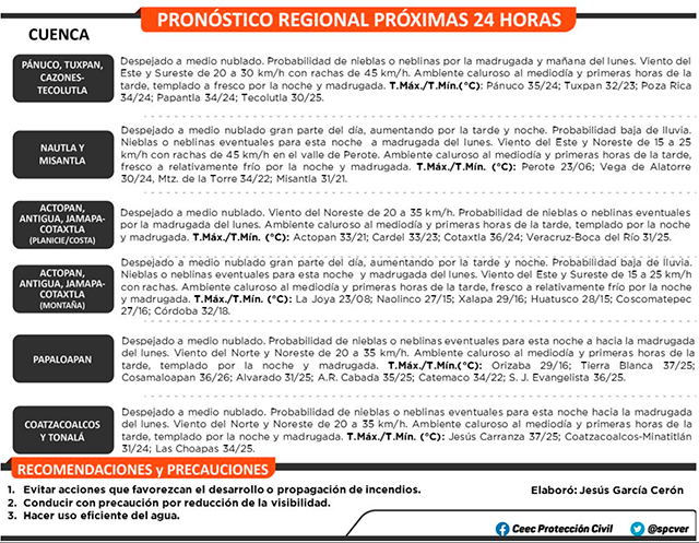 En Veracruz se prevén lluvias escasas o lloviznas (0.1 a 5.0 mm) aisladas en las inmediaciones de la Laguna de Tamiahua, costa central, cuencas del Coatzacoalcos y Tonalá, así como partes altas del Papaloapan. El viento en Tamaulipas y norte de Veracruz será del Este y Sureste de 25 a 35 km/h, presentándose rachas de 50 a 60 km/h en zona de costa, siendo del Este y Noreste con similares velocidades en el resto de esta última entidad sin rachas. Para este día, no se prevén cambios significativos con los valores de temperatura, por lo que prevalecerá ambiente cálido a caluroso en zonas montañosas caluroso a muy caluroso en el resto. Durante la madrugada, el ambiente se percibirá templado a cálido en ambas entidades y fresco a frío en zonas serranas. Temperaturas máximas para hoy: Tuxpan 32°C, Martínez de la Torre 35°C, Xalapa 30°C, Veracruz 31°C, Orizaba 30°C, Catemaco 32°C, Coatzacoalcos 33°C.