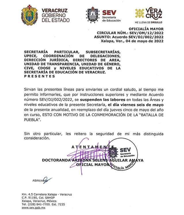 El titular de la Secretaría de Educación de Veracruz (SEV), Zenyazen Escobar García, informó que este jueves 5 mayo habrá actividades normales en las escuelas, así como en las dependencias y organismos de la SEV, a pesar de aparecer marcado en el calendario escolar como “suspensión por día feriado”.