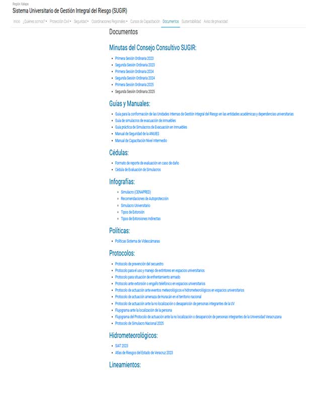“Lineamientos de actuación frente a eventos meteorológicos e hidrometeorológicos en espacios universitarios” https://www.uv.mx/sugir/files/2025/01/LineamientosMH200125.pdf, pero éstos son más bien generales y de índole administrativo, donde todo se centra en las acciones que las diversas autoridades de la Universidad deben hacer y gran parte de ellas las que tienen que hacer con relación a otras autoridades gubernamentales, pero por ningún lado se observa un “aterrizaje” a nivel de los alumnos (el grupo más numeroso y vulnerable de toda universidad).
