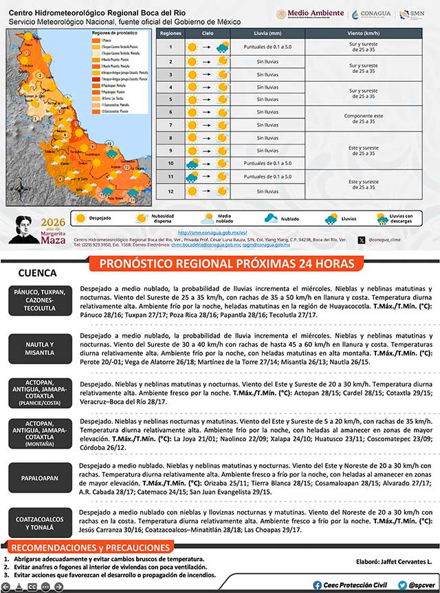 Una alta presión se localiza en el noroeste del Océano Atlántico y extiende una dorsal sobre el Golfo de México y asocia su circulación con una baja presión ubicada en el sur de Estados Unidos. En Veracruz, se espera un martes mayormente despejado, con nublados dispersos en el sur, la probabilidad de Iluvia es baja pero pueden presentarse nieblas y lloviznas nocturnas. El viento será del sureste y desarrollará rachas fuertes de 40 a 60 kilómetros por hora en el litoral norte. Las temperaturas diurnas serán relativamente altas, pero el ambiente seguirá frío por la noche, con heladas matutinas en zonas de mayor elevación. Se prevé que el miércoles aumenten los nublados y la probabilidad de lluvias ligeras, el viento cambiará al norte con rachas, además la temperatura disminuirá levemente, debido al establecimiento de una vaguada en la región,