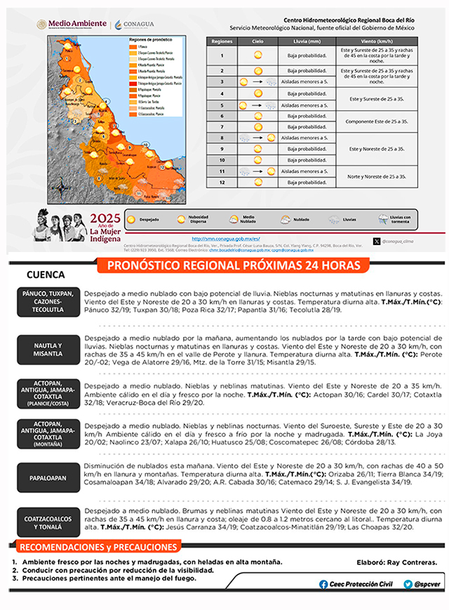 Una débil vaguada se localiza sobre el suroeste del Golfo de México y otra más sobre el Altiplano mexicano. Ambas podrían disiparse más tarde y establecerse una alta presión sobre el centro del país. Tal situación puede favorecer que mañana, en combinación con un centro de baja presión al sur de Estados Unidos, el viento sea de dirección sur, sureste y suroeste en gran parte del Estado, ocasionando que el ambiente sea cálido y bochornoso especialmente en zonas de llanura y costa. Finalmente, un frente frío tiende a moverse hacia el Golfo de México sin afectar el territorio veracruzano. Por lo anterior, se sigue exhortando a la población a extremar las precauciones por efectos adversos de las altas temperaturas y bajo potencial de lluvias.