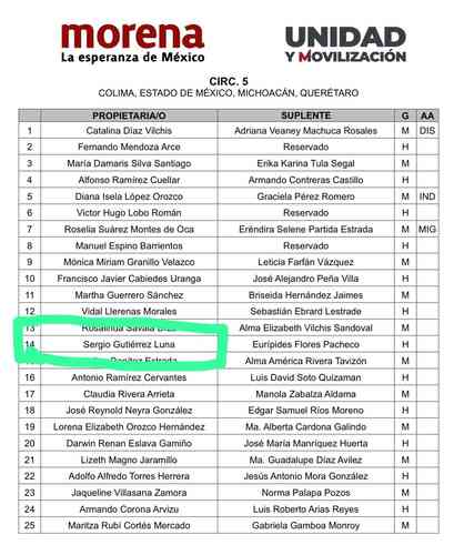 Por otra parte, el expresidente de la Cámara Federal de Diputados y ex aspirante a gobernador por Veracruz, Sergio Gutiérrez Luna, fue incluido en la lista de candidatos a diputados plurinominales por MORENA en la Quinta Circunscripción que abarca: Colima, Estado de México, Michoacán y Querétaro, pero en el lejano lugar 14, donde lleva de suplente a Eurípides Flores Pacheco.