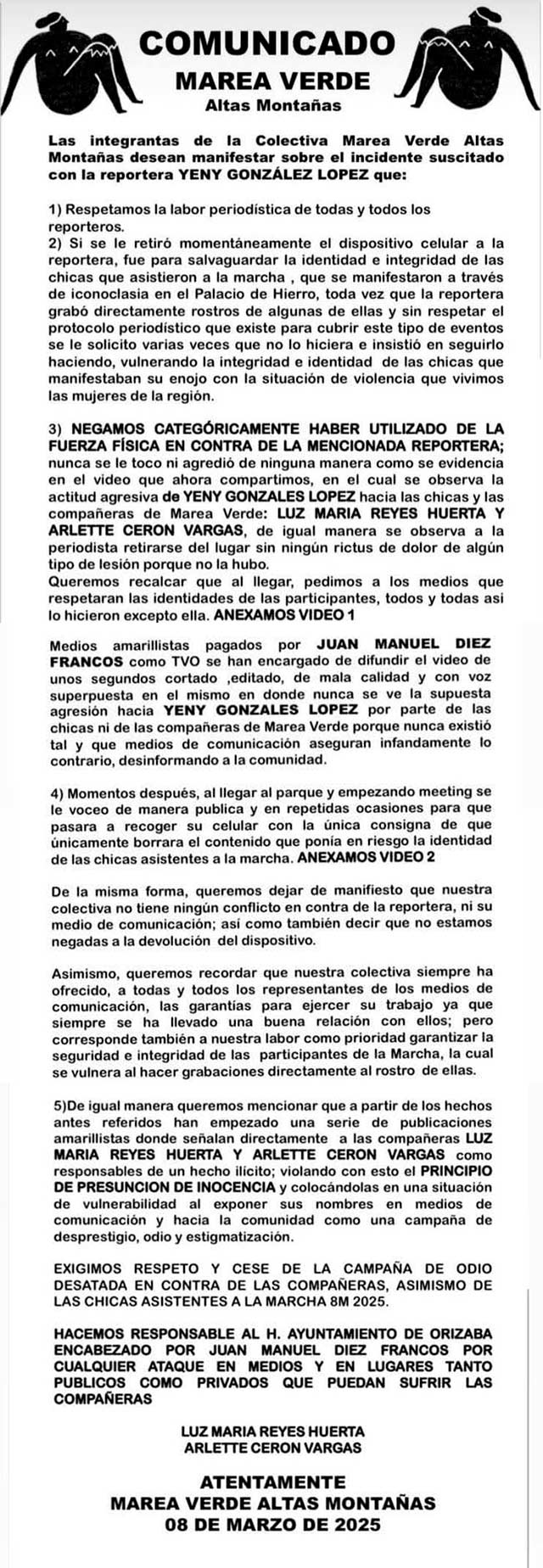 Luego de los hechos donde la colectiva aseveró que no hubo golpes pero la comunicadora dijo que tenía contusión en la cabeza y presión alta, se han despertado diversas opiniones sobre este hecho, que se conoce ya llegó hasta la fiscalía. Por su parte, la agrupación de Marea Verde ya emitió un comunicado donde se pronuncia al respecto.