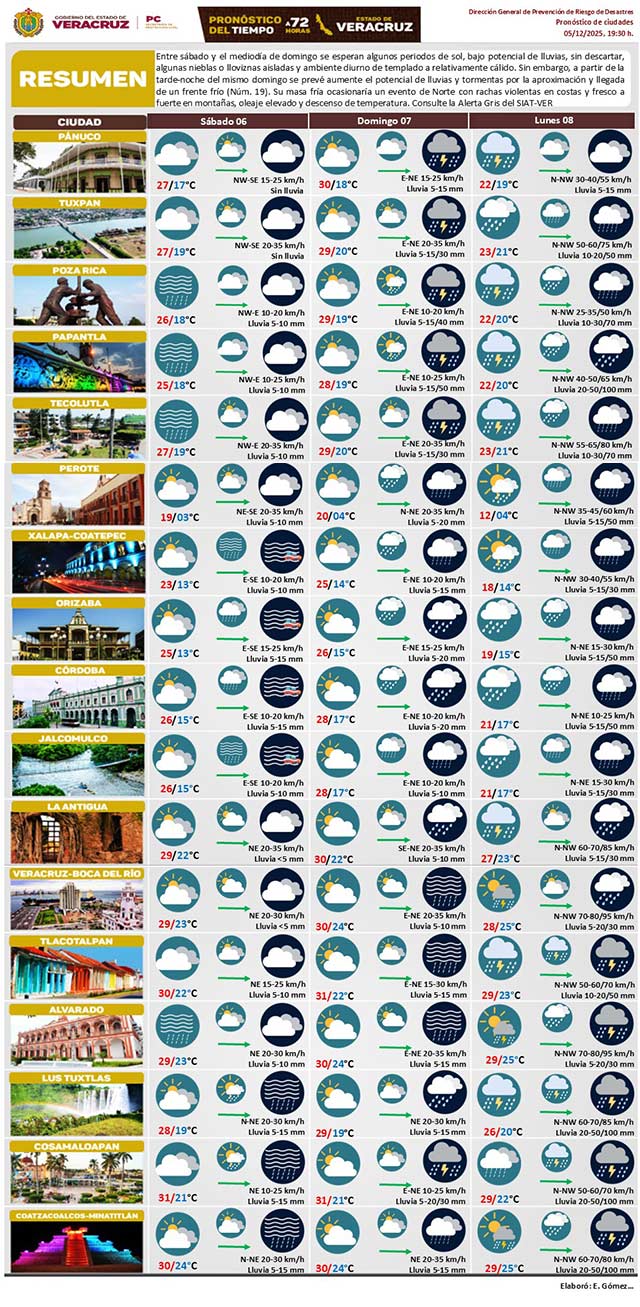 Sábado soleado y bajo potencial de lluvias, sin descartar nieblas o lloviznas aisladas y ambiente diurno de templado a cálido. A partir de la tarde-noche del domingo se prevé aumente potencial de lluvias por aproximación de un frente frío (número 19). Evento de “norte con” rachas violentas en costas y descenso de temperatura.