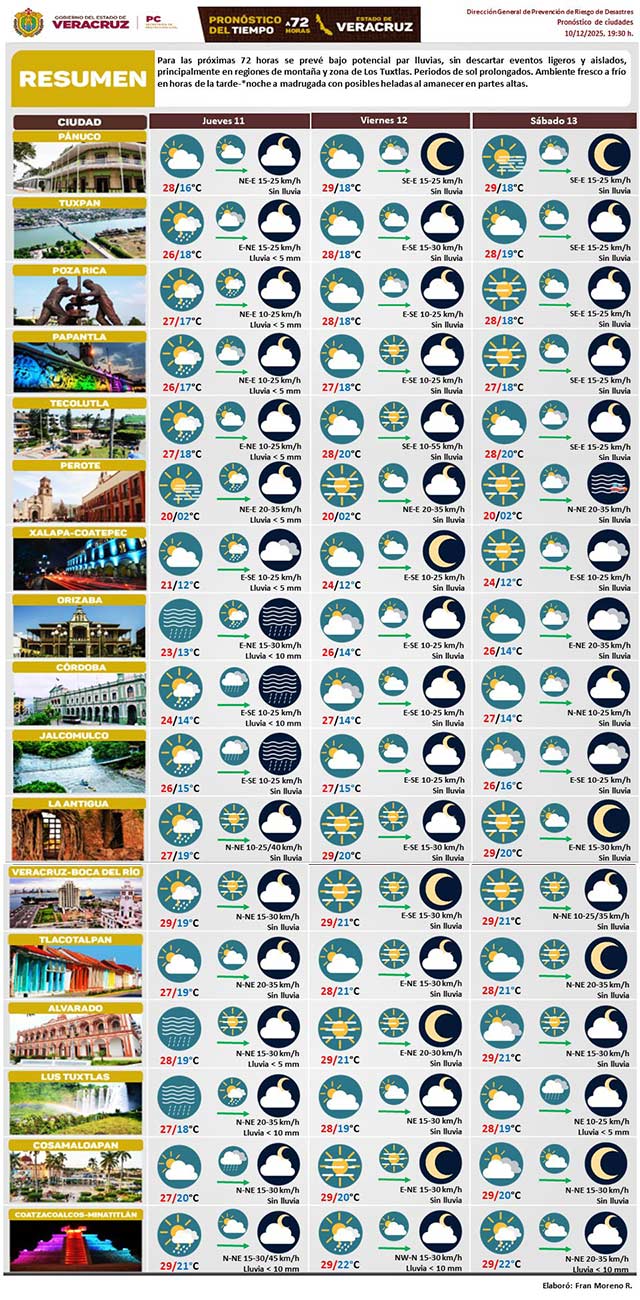 Para las próximas 72 horas se prevé bajo potencial para lluvias, sin descartar eventos ligeros y aislados, principalmente en regiones de montaña y zona de Los Tuxtlas. Periodos de sol prolongados. Ambiente fresco a frío en horas de la tarde-noche a madrugada con posibles heladas al amanecer en partes altas.