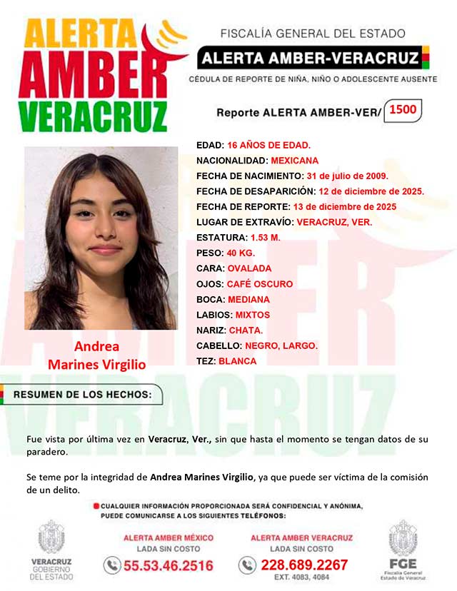 El programa Alerta Amber Veracruz, agradece su colaboración e informa la ACTIVACION de la ALERTA AMBER- VERACRUZ 1500 por la adolescente Andrea Marines Virgilio de 16 años de edad.