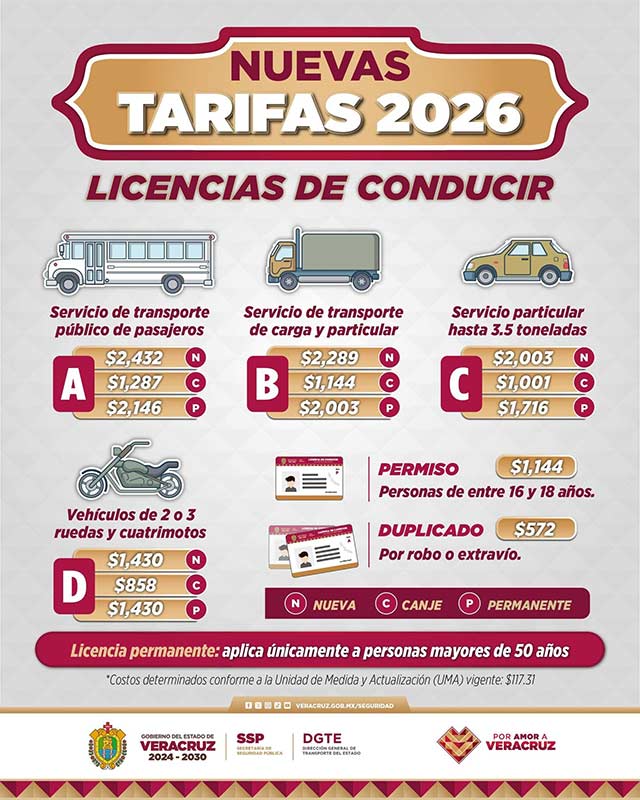 La Secretaría de Seguridad Pública informó que debido a la actualización de la UMA 2026, los costos en las licencias de conducir tuvieron un incremento. “Revísalos y considéralos si vas a realizar tu trámite próximamente”, pide la dependencia.