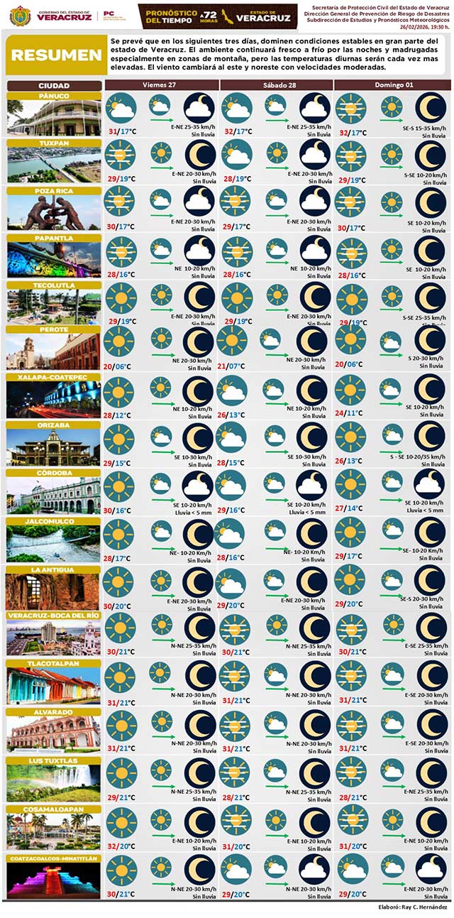 Se prevé que siguientes días dominen condiciones estables en gran parte del estado. Ambiente seguirá fresco a frío por las noches y madrugadas especialmente en zonas de montaña, pero las temperaturas diurnas serán cada vez más elevadas. Viento cambiará al este y noreste con velocidades moderadas.