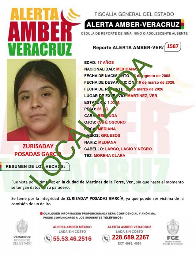 El programa Alerta Amber Veracruz, agradece su colaboración e informa la DESACTIVACIÓN de la ALERTA AMBER- VERACRUZ 1587 por la adolescente ZURISADAY POSADAS GARCÍA de 17 años de edad.