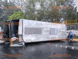 De acuerdo con los primeros informes, el operador de la unidad, perteneciente a la línea Miradores, habría perdido el control al circular presuntamente a exceso de velocidad sobre pavimento mojado, lo que derivó en la volcadura del vehículo sobre la cinta asfáltica.