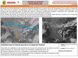 La Secretaría de Protección Civil de Veracruz (PC) emitió un Aviso Especial ante el ingreso del frente frío número 33, que desde este miércoles por la noche y hasta la tarde del jueves provocará un incremento de nublados, lluvias, tormentas aisladas y un evento de norte con rachas fuertes de viento en gran parte del estado.