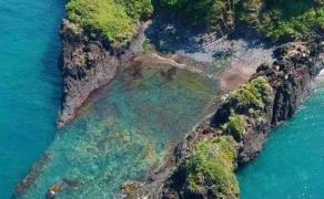 Las cavidades de lava petrificada que se formaron a raíz de erupciones volcánicas formaron un cenote de aguas saladas y color turquesa en esta playa.