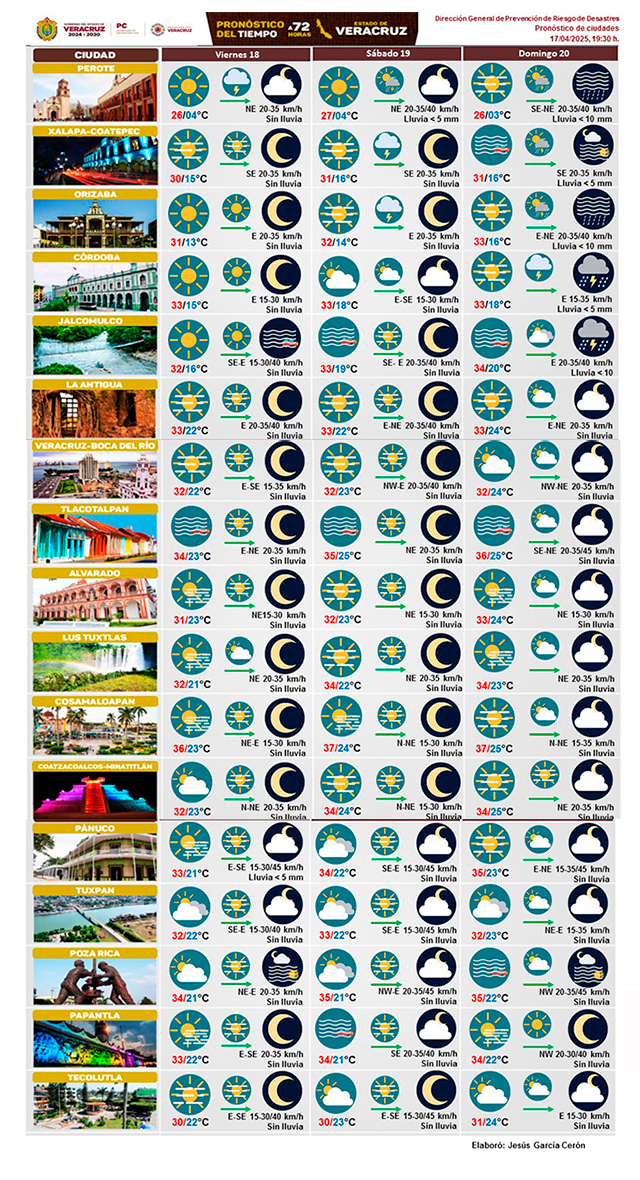 En siguientes días se prevé bajo potencial de lluvias sin descartar eventos aislados en zonas montañosas, especialmente en la tarde-noche del domingo. Temperatura irá en aumento; en la noche y madrugada ambiente fresco a frío. Dominará viento del este, sureste y noreste, de 20 a 35 kilómetros por hora con algunas rachas en costas y montañas.