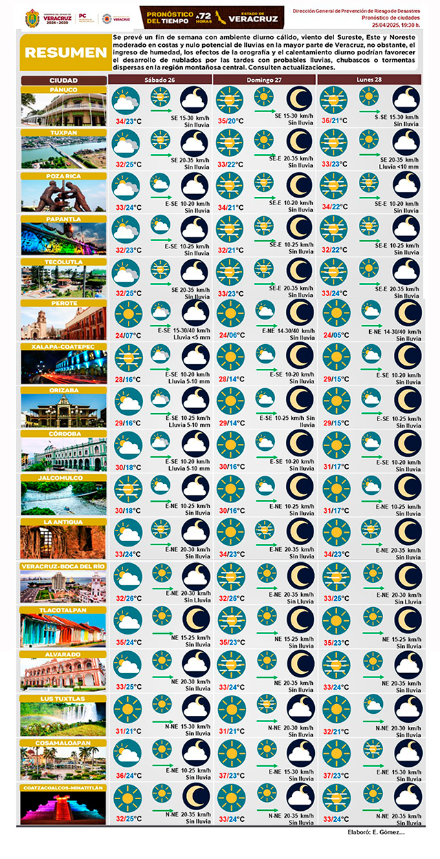 Fin de semana con ambiente diurno cálido, viento moderado en costas y nulo potencial de lluvias en la mayor parte de Veracruz. No obstante, el ingreso de humedad, los efectos de la orografía y el calentamiento diurno podrían favorecer el desarrollo de nublados por las tardes con probables lluvias, chubascos o tormentas dispersas en la región montañosa central.