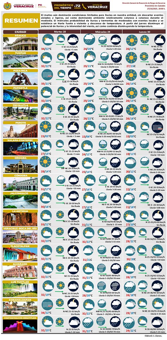 Martes con condiciones limitadas para lluvias sin descartar eventos aislados y ligeros; ambiente caluroso durante el mediodía. El miércoles probabilidad de lluvias y tormentas moderadas con eventos locales; “norte” fuerte a violento y descenso de temperatura. A partir del jueves baja potencial y continúa disminuyendo la temperatura.