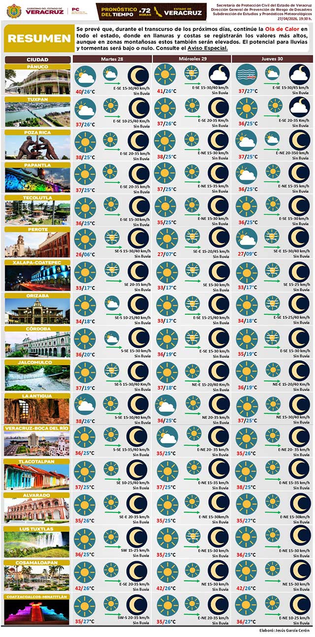 Se prevé que en el transcurso de los próximos días continúe la “ola de calor” en todo el Estado, donde en llanuras y costas se registrarán los valores de temperatura más altos, aunque en zonas montañosas también serán elevados. El potencial para lluvias y tormentas será bajo o nulo. Consulte el Aviso Especial.