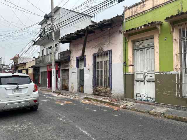 Xalapa, Ver., 30 de abril de 2025.- En el número 75 de la calle Altamirano, entre Betancourt y José Azueta, se cayeron pedazos de alero con tejas y canaleta. El resto también amenaza con caer, poniendo en riesgo a transeúntes.