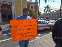 Trabajadores del SETSUV se manifestaron en la zona centro de Xalapa para exigir un aumento salarial del 20 por ciento, la revisión del contrato colectivo de trabajo y la nivelación respecto al salario mínimo de este año. Los manifestantes recriminaron que, tras el reciente ajuste al salario mínimo, el personal del SETSUV percibe un ingreso menor al establecido por la ley.