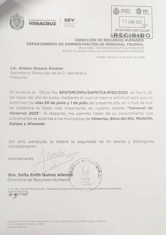 Xalapa, Ver., 17 de junio de 2025.- Tras las críticas por excluir a Xalapa de la suspensión de labores por el Carnaval, la SEV comenzó a circular otro oficio y la Capital vuelve a ser incluida entre los municipios con días de asueto. Según trabajadores, el documento se generó este mismo martes, pero le pusieron fecha de “13 de junio”.
