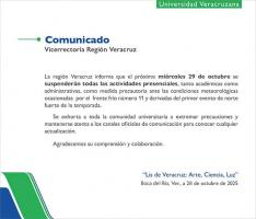 La Universidad Veracruzana Región Veracruz informa que el miércoles 29 de octubre se suspenderán todas las actividades presenciales, tanto académicas como administrativas, como medida precautoria ante las condiciones meteorológicas ocasionadas por el frente frío número 11 y derivadas del primer evento de norte fuerte de la temporada.