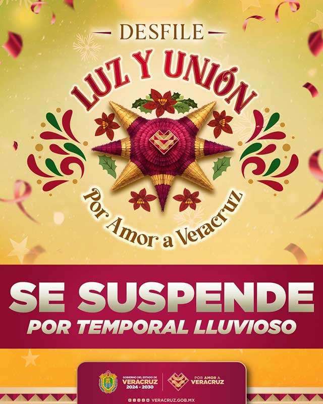 Protección Civil informó que debido al temporal lluvioso se suspende el desfile “Luz y Unión” en el Centro de Xalapa a fin de proteger la integridad de las y los participantes, así como del público asistente. El evento será reprogramado para el Día de Reyes.