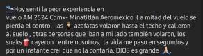 Un evento de turbulencia provocó pánico entre pasajeros del vuelo AM 2524 de Aeroméxico, proveniente de la Ciudad de México con dirección a Minatitlán, este miércoles.
