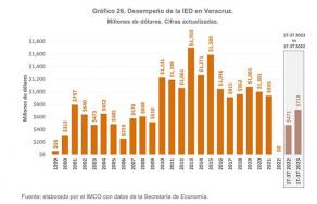 El observatorio puntualiza que al comparar el desempeño de enero-septiembre de 2022 contra igual periodo de 2023 la inversión extranjera aumentó en Veracruz de 471 a 718 millones de dólares. Sin embargo, el mayor techo de la inversión extranjera se alcanzó en 2013, cuando hubo una derrama económica de mil 703 millones de dólares.