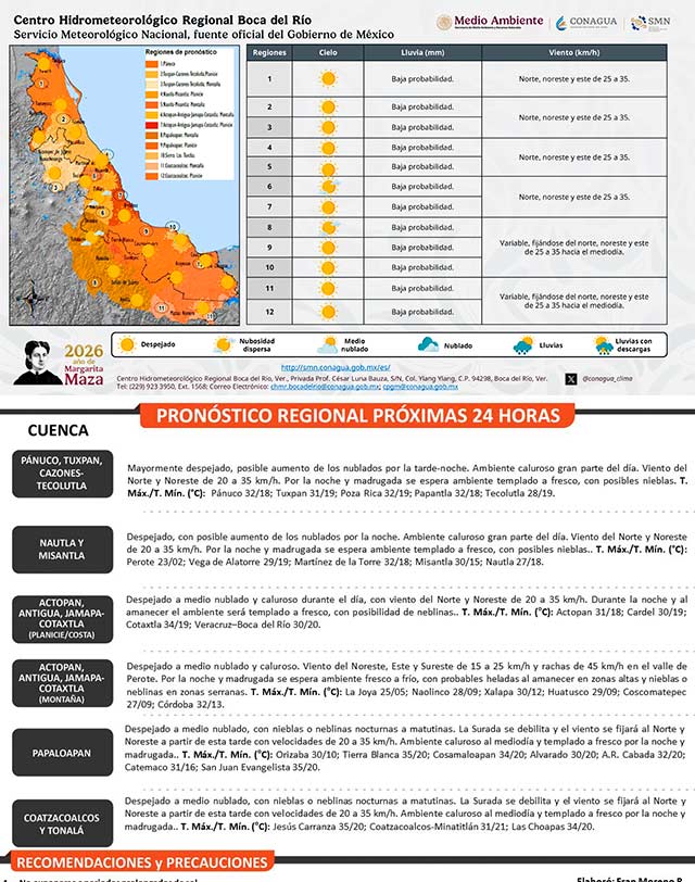 Para este fin de semana se prevé ambiente cálido mediodía y parte de la tarde, fresco a frío por las noches y madrugadas con probables heladas en partes altas. Probabilidad baja de lluvias, aunque, no se descartan algunos eventos ligeros y aislados. Nieblas y neblinas eventuales. Viento dominante del noreste, este y sureste de 20 a 35 kilómetros por hora en costas con rachas en el litoral norte.